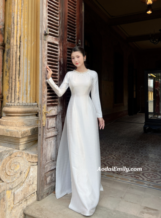 EMERIE Pre made plain White color with crystals collar | Pre made long dress| Ao dài Việt| No pants| S-3XL