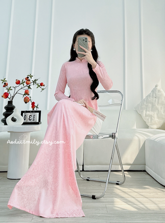 AURORA Ao dài gấm | Rose patterns Pink Pre made ao dai Vietnam with crystals collar | Women long dress| No pants