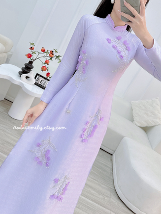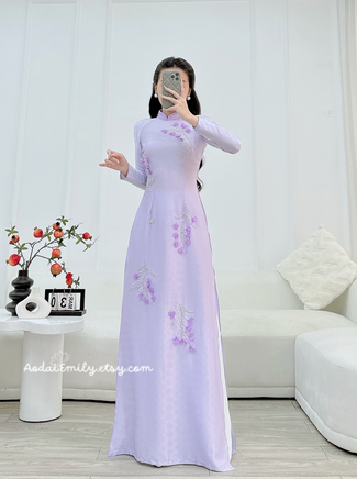 CATHERINE Purple Lily of the valley flowers with crystals| Pre made long dress| Ao dài Việt|| No pants|