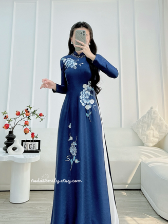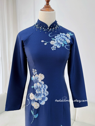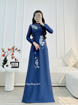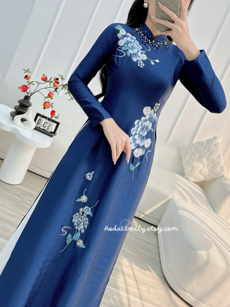 BLUEBELL Hand beading collar with embroidery flowers with crystals| Pre made long dress| Ao dài Việt| No pants