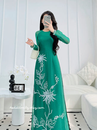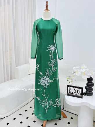 CLAIRE Dark Green ao dai with handed beading flowers and crystals | Double layers ao dai |Ao dai for special events| No pants