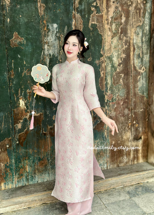 ELLIE Pastel Pink Spring flowers pattern| Taffeta ao dai set| With pants|