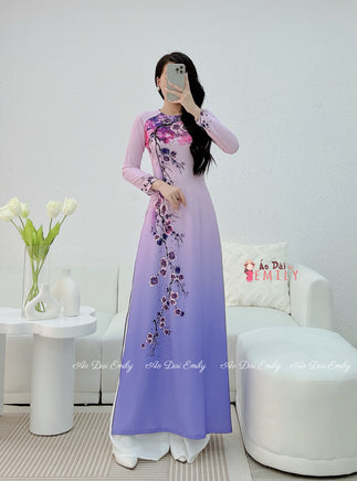 EVIE Ombre Purple Printed flowers pattern| Pre made ao dai for women| Vietnamese long dress| No pants|