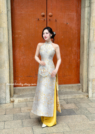 FREYA Yellow/Neutral Sleeveless Taffeta Sakura patterns Pre made ao dai| | Ao dai yếm Women| With yellow pants