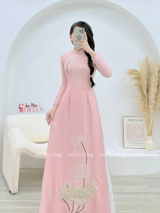 KENDALL Aó dài with embroidery Lotus & Crystals | Pre made Vietnamese long dress| traditional dress | Pink| No pants| S-6XL