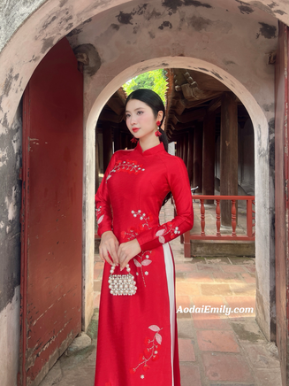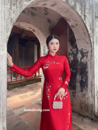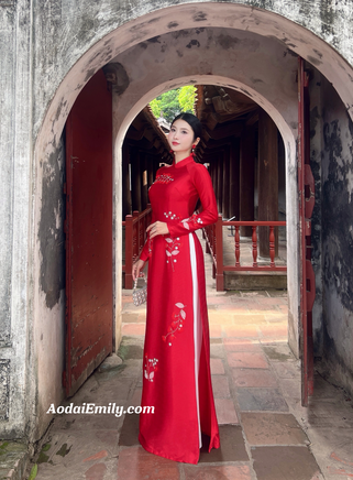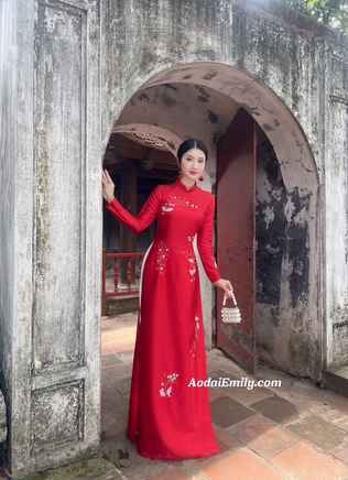 COLETTE Red Lily flowers with crystals| Pre made long dress| Ao dài Việt| Ao dài cô dâu| Bridesmaids| No pants| S-3XL