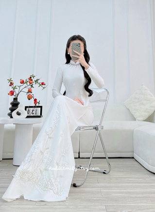 MAISIE White 3D flowers with Hand beading crystals Ao dai| Pre made Vietnamese long dress| Ao dài Việt| No pants|