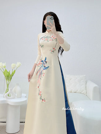 MIA Cream/Blue Spring Flowers Ao Dai set| Taffeta Ao Dai| Modern Vietnamese Long dress| With pants