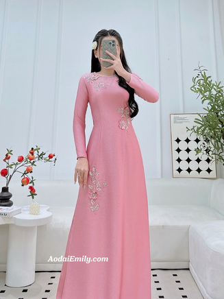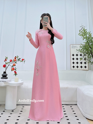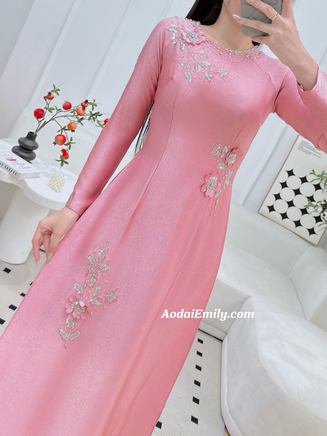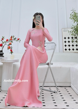 OPAL Pink Hand beading 3D flowers with crystals| Pre made long dress| Ao dai for bridesmaids| With pink pants| S-3XL