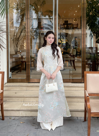 ZURI Beige Neutral color Ao Dai with spring patterns | Pre-made Ao Dai | Ao Dai for women| No Pants| Trending ao dai| S-6XL