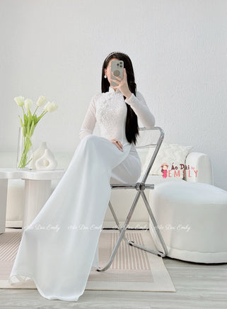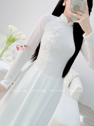 ZOE Ao dai with designed crystals, pearls and 3D flowers| Double layers chiffon ao dai| | Bridal| Ao dai for brides| No pants