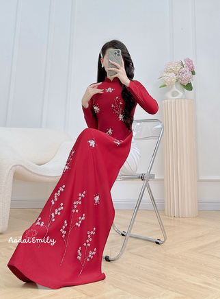 OLIVE Hand beading crystals and pearls traditional Ao dai| Pre made Vietnamese long dress| Ao dài Việt| No pants| S-5XL