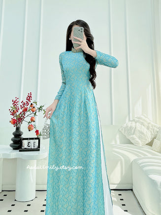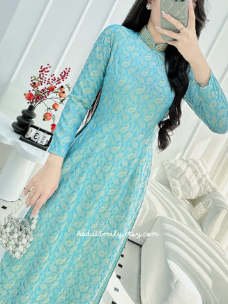 ORLA Pre made traditional  ao dai  with crystals collar | | Ao dài gấm| Vietnamese long dress| Ao dai for women| No pants|