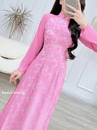 BESSIE Pink Ao Dai Gấm set with pearls | áo dài gấm | Vietnamese long dress| traditional Women dress | with pants