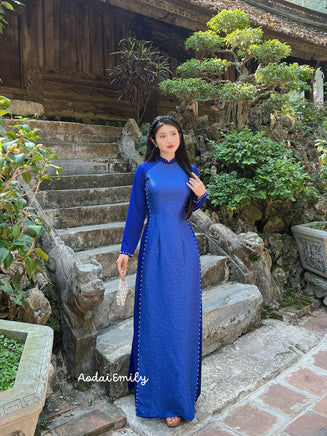 BEATRICE Sapphire Blue ao dai set with pearls | áo dài gấm | Vietnamese long dress| traditional with pants| S-6XL