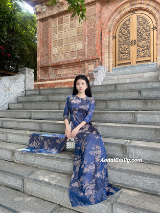 GISELLE Dark Blue Ao dài gấm with crystals | Pre made ao dai Vietnam| Women long dress| No pants| Uniform ao dai| S-2XL