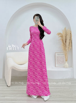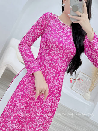 PAISLEE Ao dài lụa màu hong kết hạt| Pre made ao dai | Vietnamese long dress| | Fuchsia daisy pattern ao dai with crystals| No pants| S-5XL