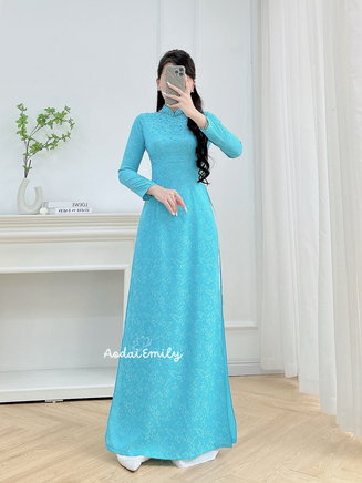 DOVIE blue Pre made ao dai Vietnam with hand beading crystals collar