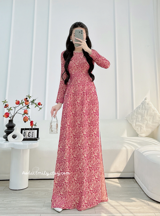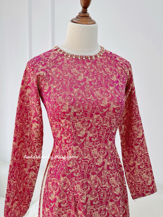 TAYTUM Ao dài gấm | Rose patterns Pre made ao dai Vietnam with crystals collar | Women long dress|| Vietnamese long dress| No pants| S-XL
