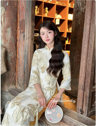 ISIA Cream/ Gold double layers modern ao dai with roses| áo dài cách tân| With gold pants| Ao dai women