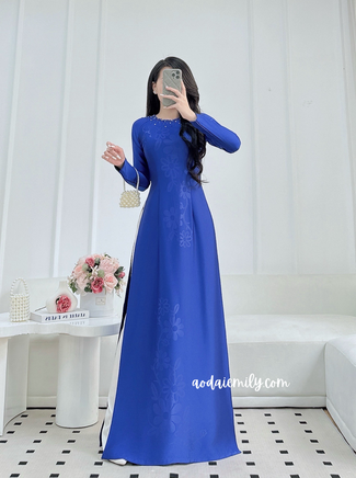 JACQUELINE Deep Blue ao dai with simple crystals round collar