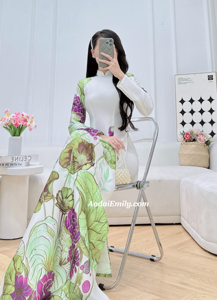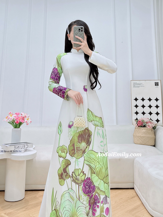 MARA Printed Lotus flowers pattern Pre made ao dai for women| Vietnamese long dress| No pants|S-5XL