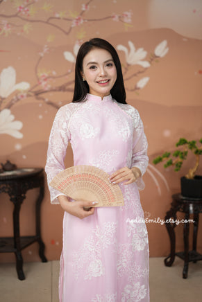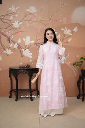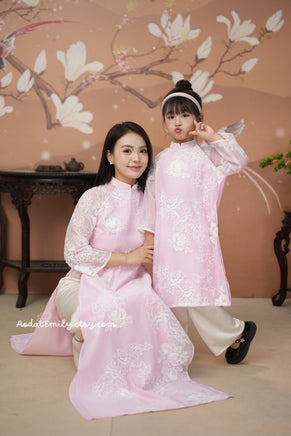 KEIRA Pastel Pink Matching Mom and baby Girl Ao Dai Set embroidery patterns| Ao Dai Lunar New Year | With pants|