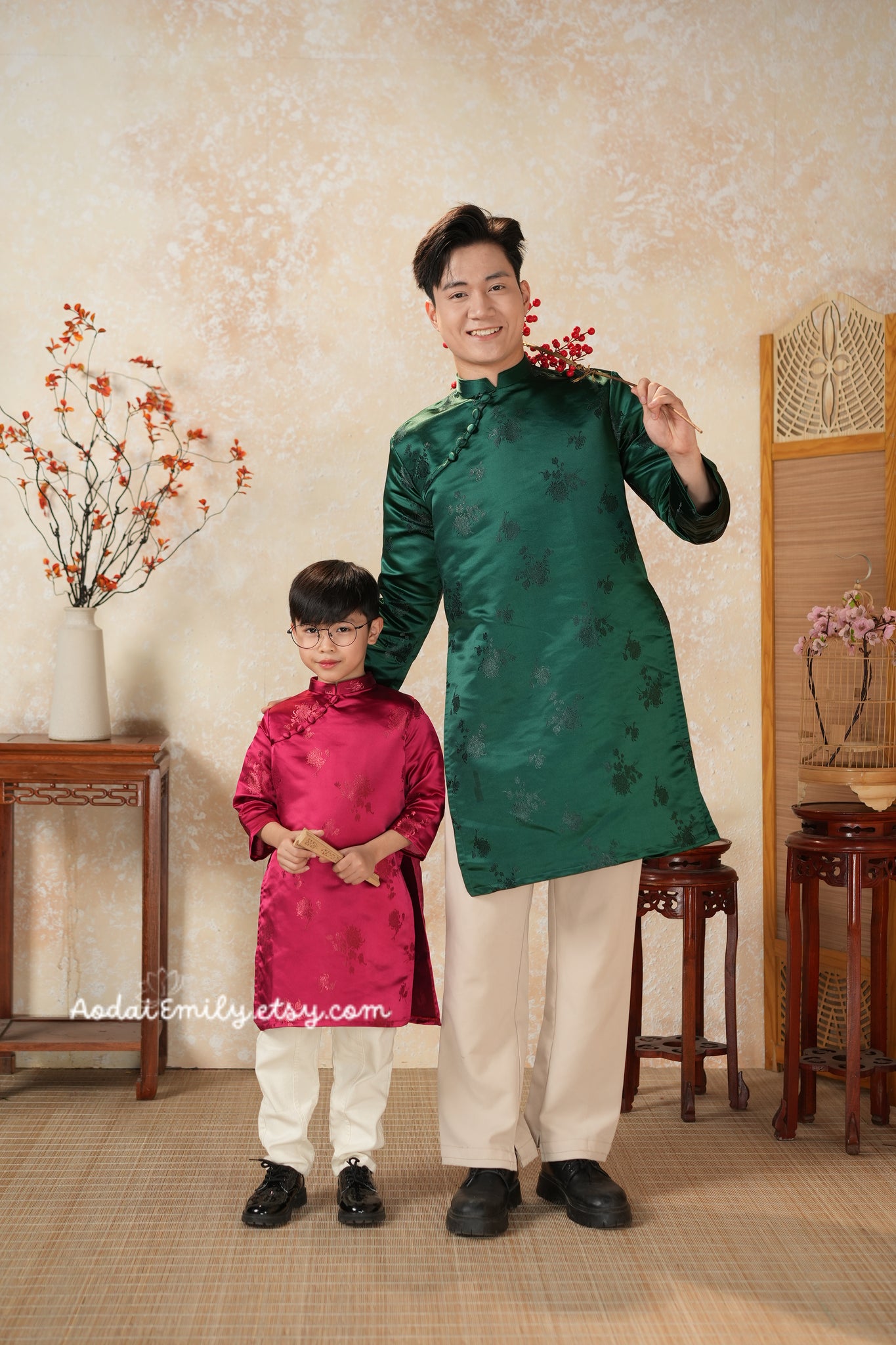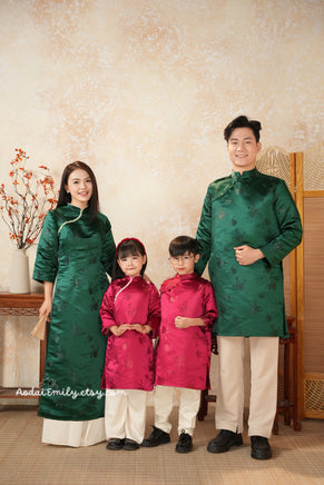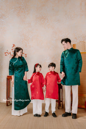 ANDIE Green/ Red Matching Family Daisy pattern Ao Dai Set| Pre-made Ao Dai for Lunar New Year | Ao Dai Gia Dinh Tet|