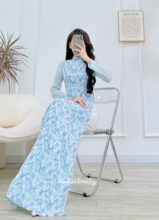 OCEAN Mini flowers Pre-made Ao dai | Ao dai for women| Ao Dai Viet Nam| Vietnamese long dress| No pants