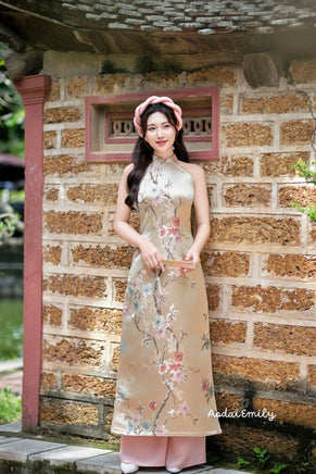 WISTERIA Sleeveless Taffeta Sakura patterns Pre made ao dai| | Ao dai yếm Women| No pants | No headpieces | Lunar new year| S-5XL