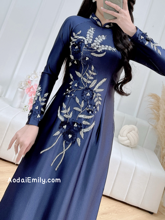 SOLANA | Dark Blue 3D flowers with hand beading crystals Pre made ao dai| Pre made long dress| Valentino silk| No pants| S-3XL
