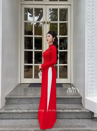 FLORA Ao dai with crystals, pearls and 3D flowers| Red chiffon ao dai| |Ao dai for events| Bridal| Ao dai for brides| No pants