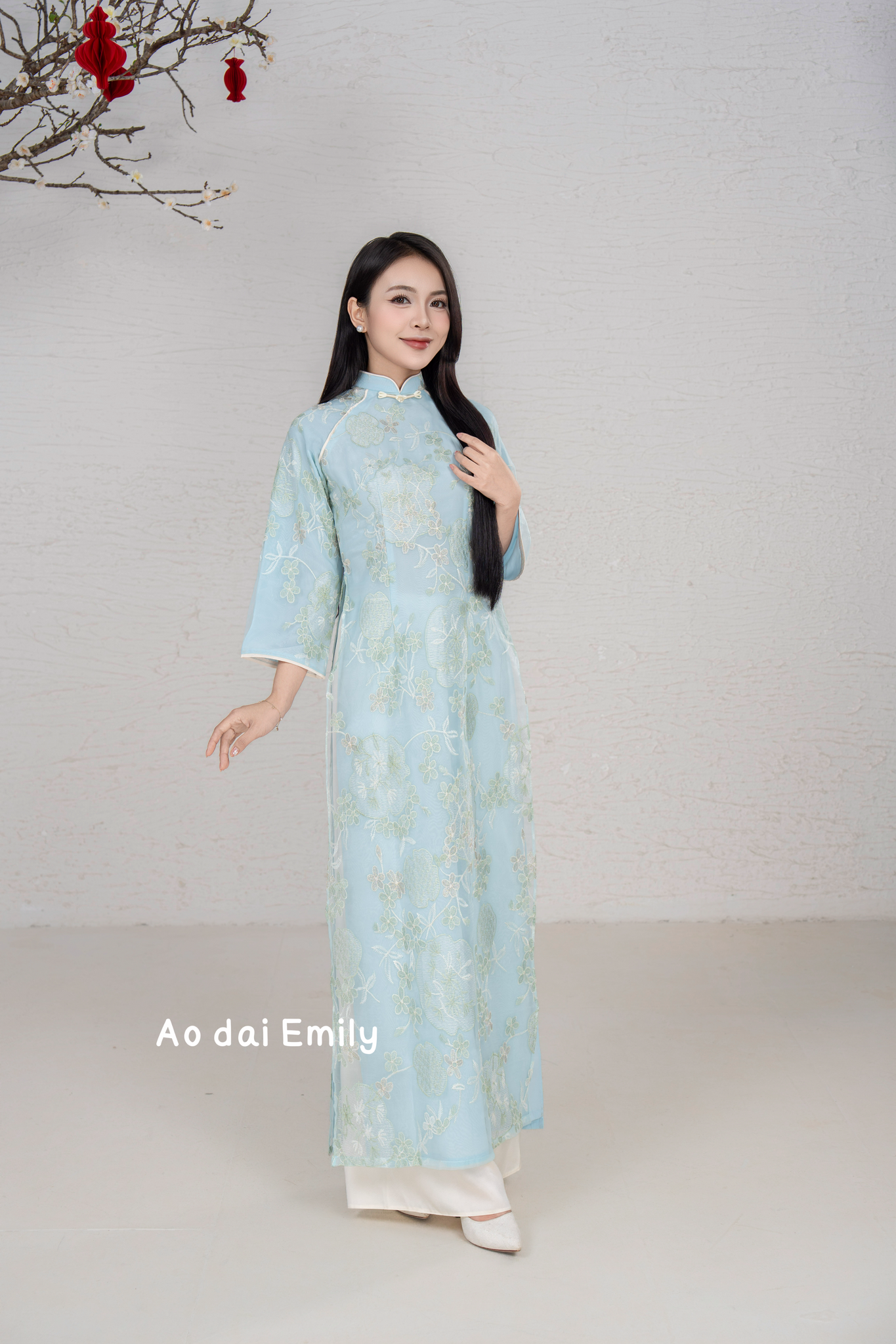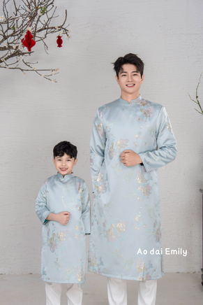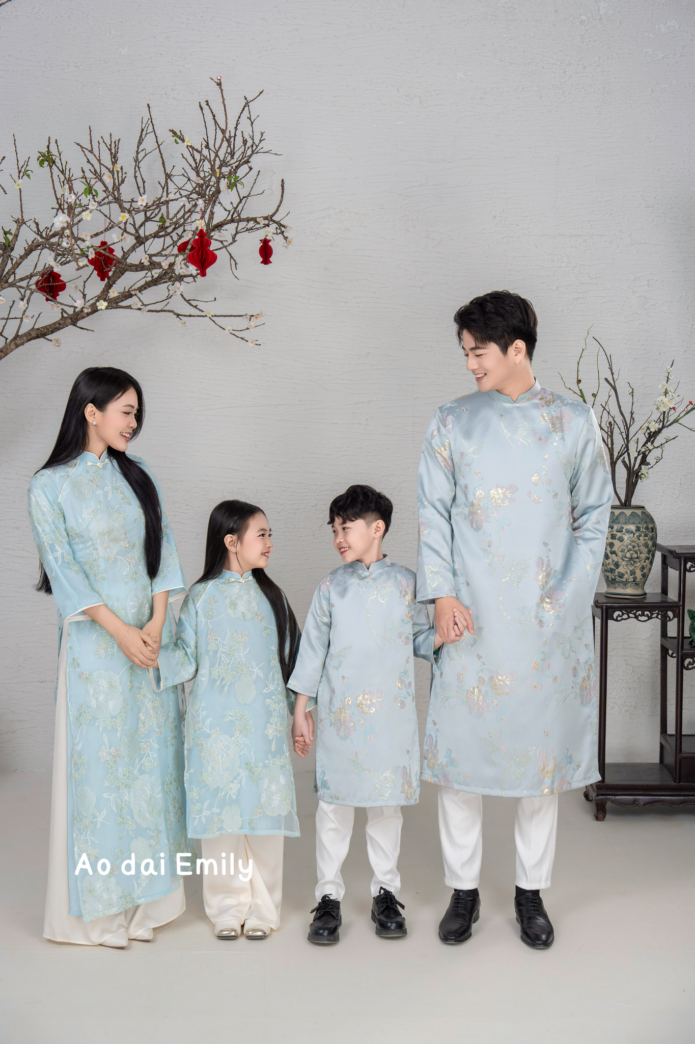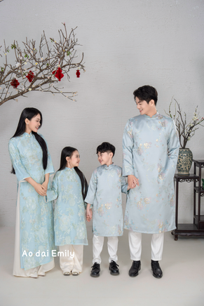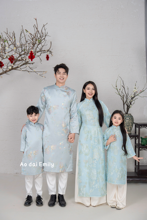 Light Blue Matching Family Spring patterns Ao Dai Set| Pre-made Ao Dai for Lunar New Year | Ao Dai Gia Dinh Tet| Embroidery Ao dai