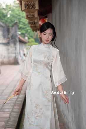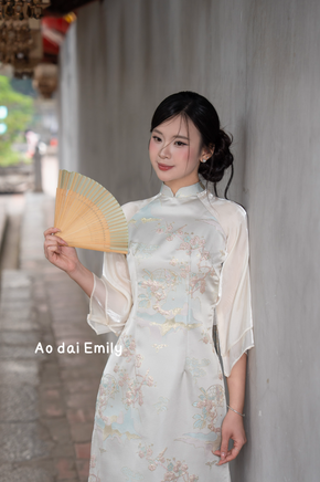 Beige Taffeta Ao dai with Spring pattern| With pants| Ao dai Cach tan| Ao dai Vietnam| Lunar New year| Trendy Ao dai| S-4XL