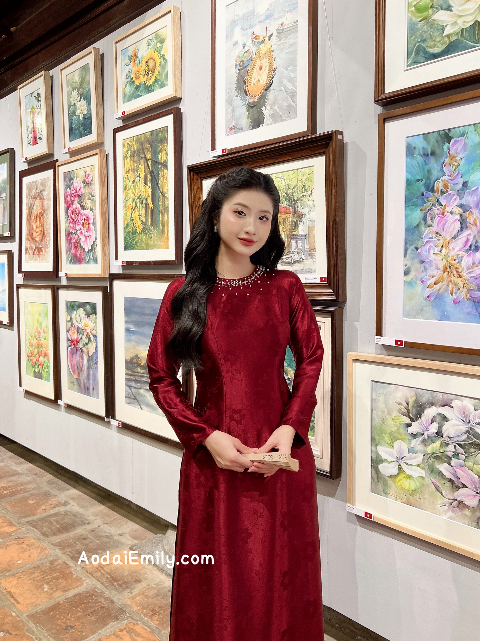 ELYSE Burgundy Ao Dai Gấm with crystals round collar | Flower patterns| áo dài gấm | traditional Women dress | No pants| S-6XL