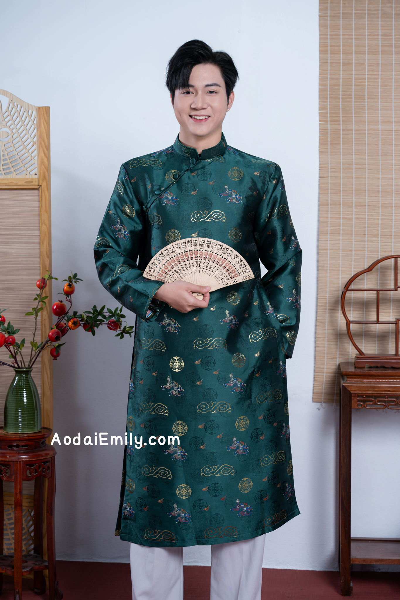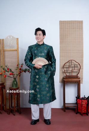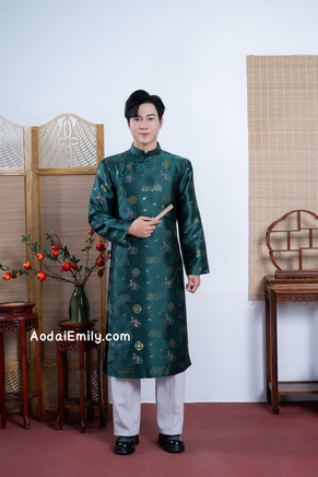 Dark Green Ao dai for men with new year patterns| Pre made ao dai for men| Slim fit| add 2-3 size to your T shirt size| M-6XL