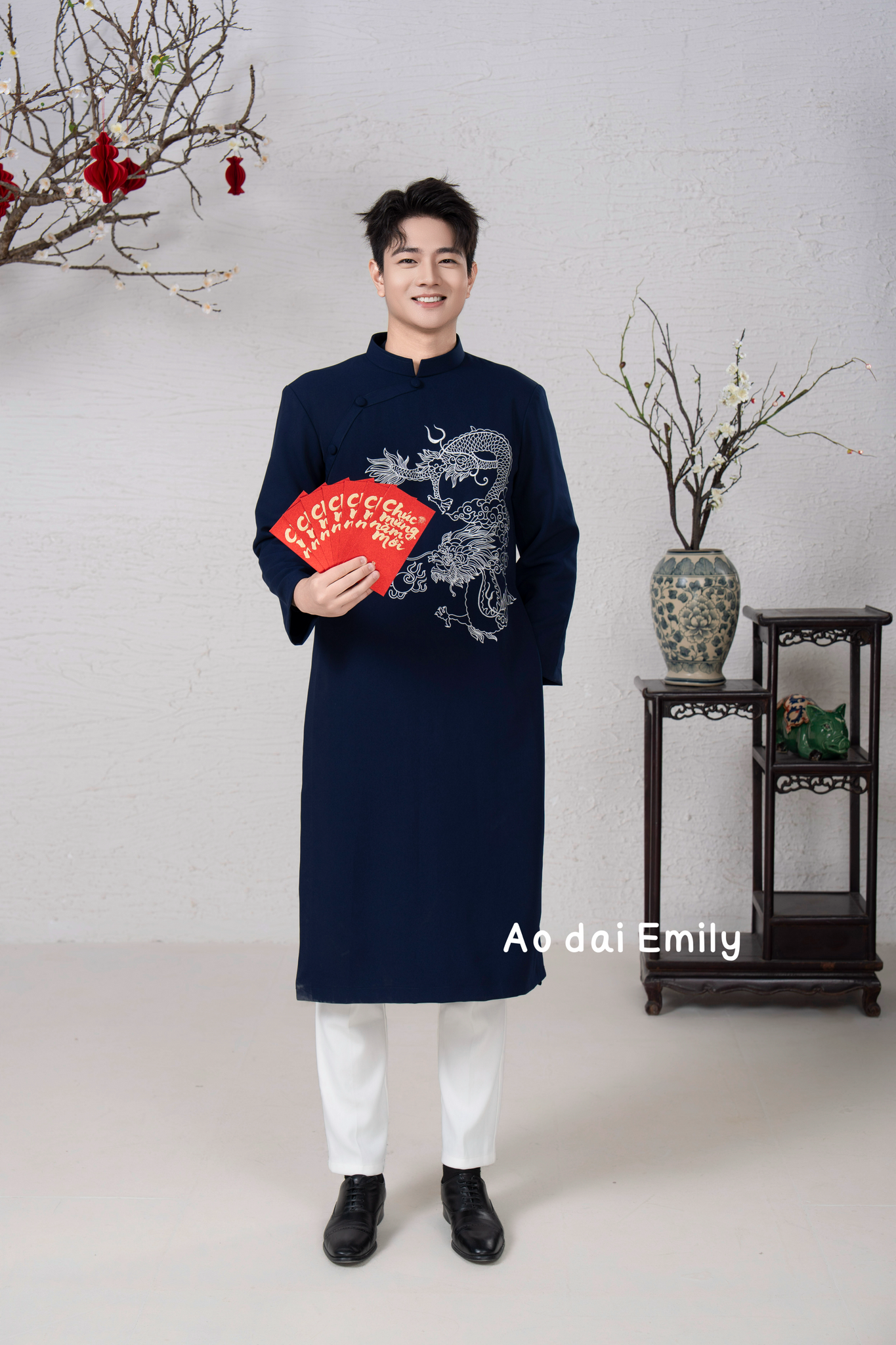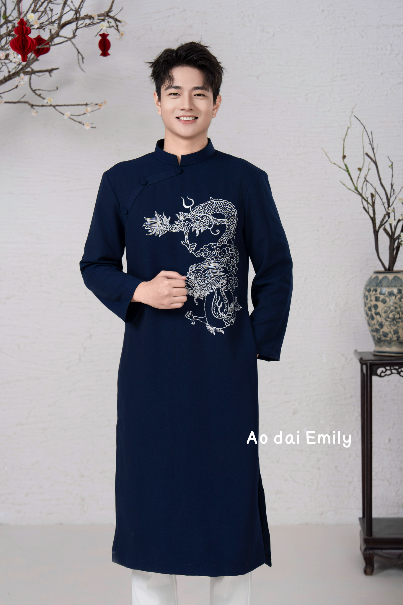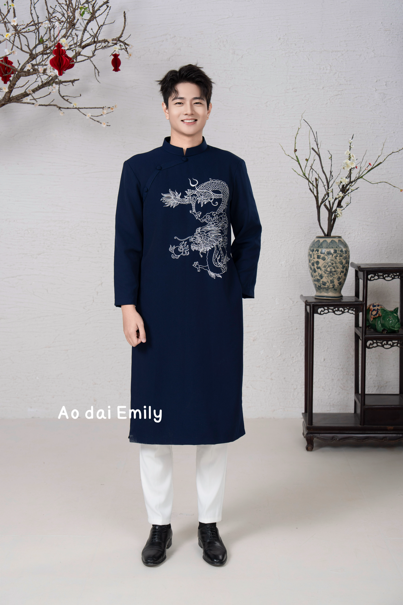 Midnight Blue Ao dai for men with Dragon embroidery| Pre made ao dai for men| Slim fit| add 2-3 size to your T shirt size| M-6XL