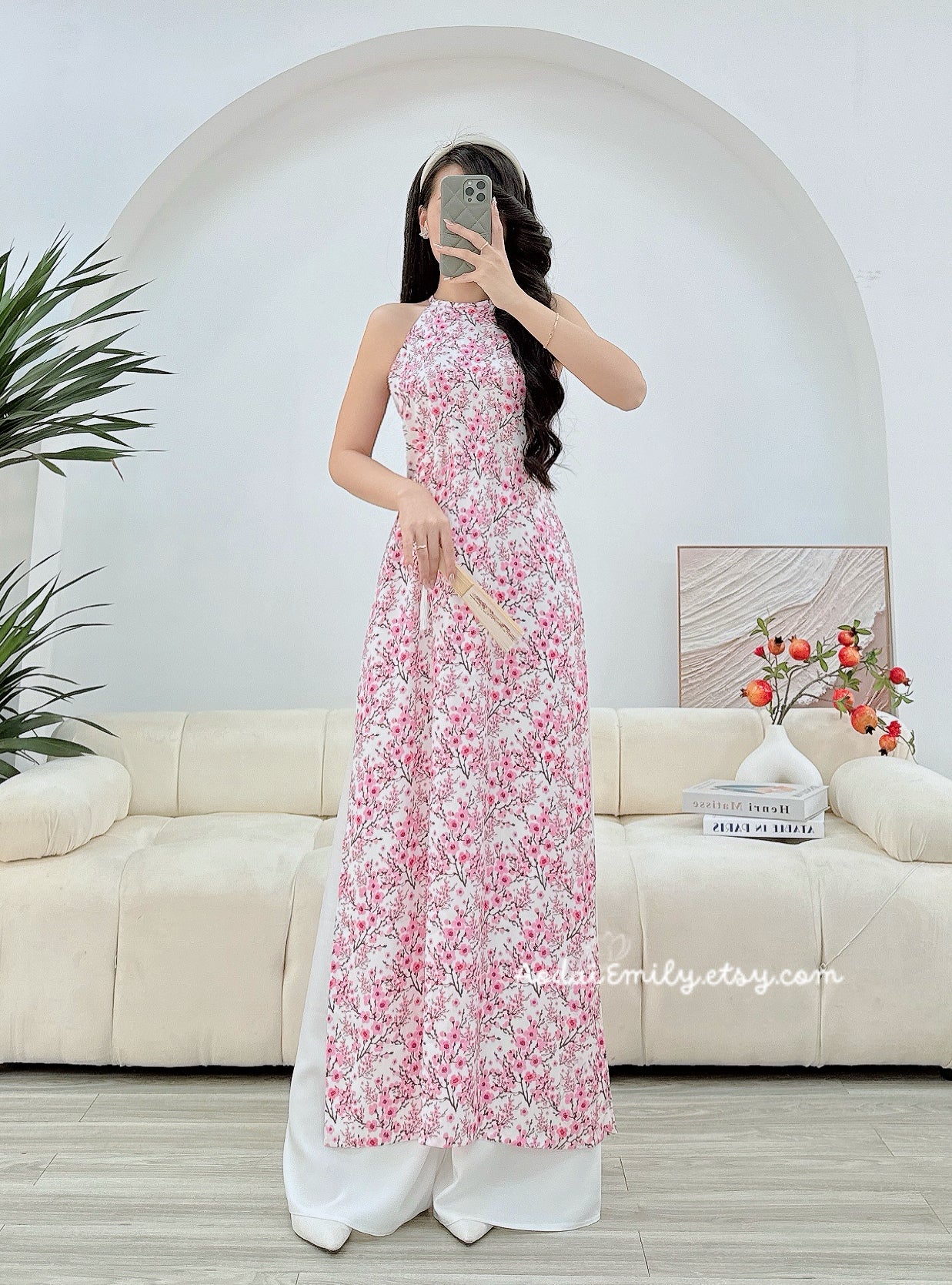 INDIE Fuchsia Sleeveless Mini sakura blossom Pre made ao dai|  | Ao dai yếm Women| No pants| S-5XL