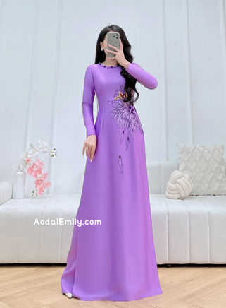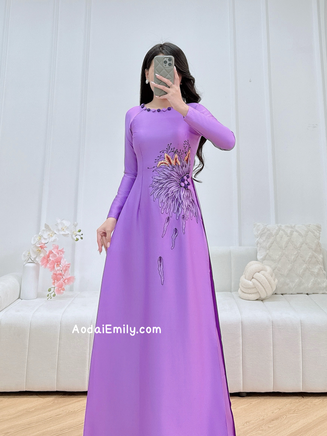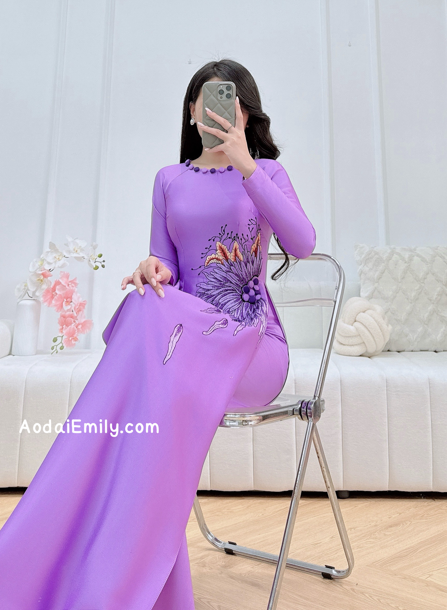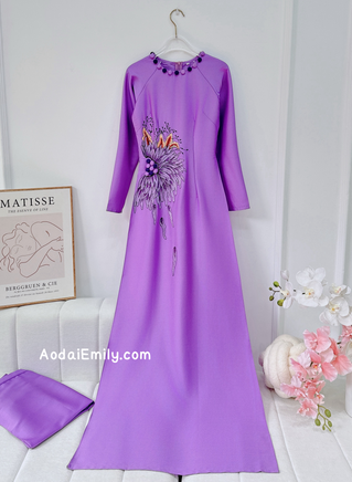 JAZMIN Purple Embroidery Sunflowers with hand beading buttons| Pre made ao dai| Pre made long dress| With same color pants| S-3XL