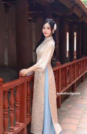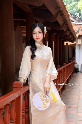 JENNA Beige/ Blue Taffeta Spring flowers pattern Ao dai| Taffeta ao dai set| With Blue pants| Modern ao dai for Lunar new year| S-8XL