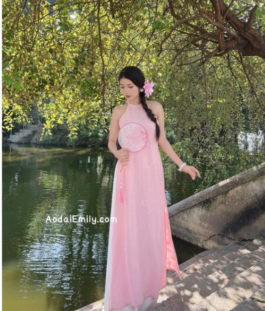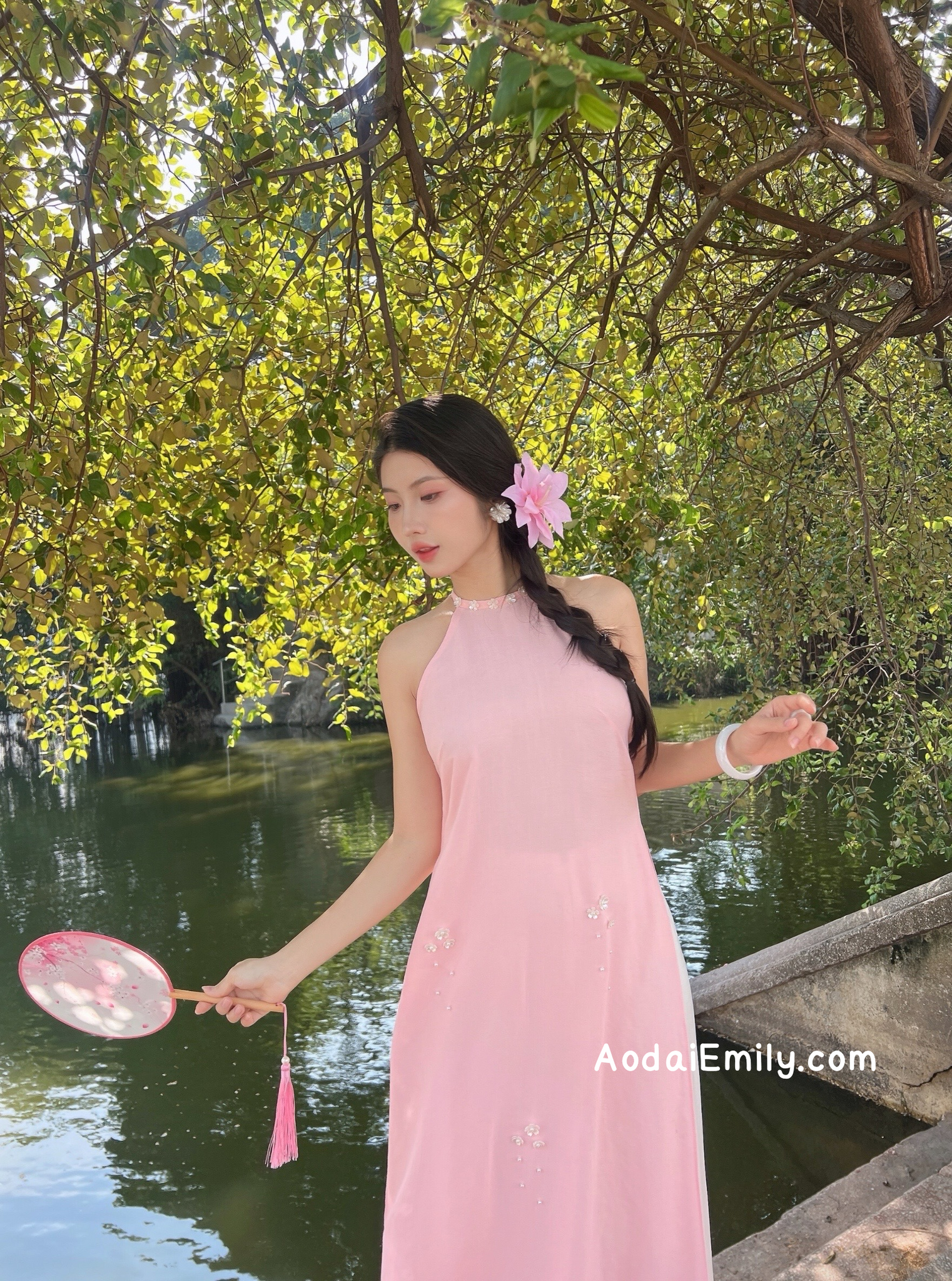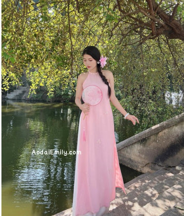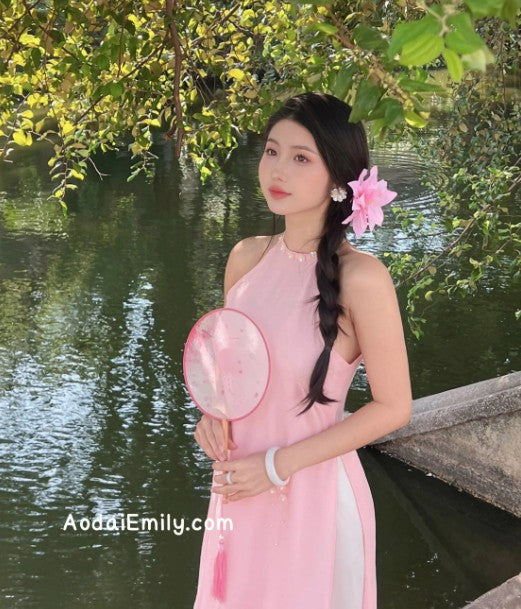 LAKELYN Pink Sleeveless Pre made ao dai simple hand beading flowers| Ao dai yếm | Ao dai for Lunar new year| No pants| S-6XL