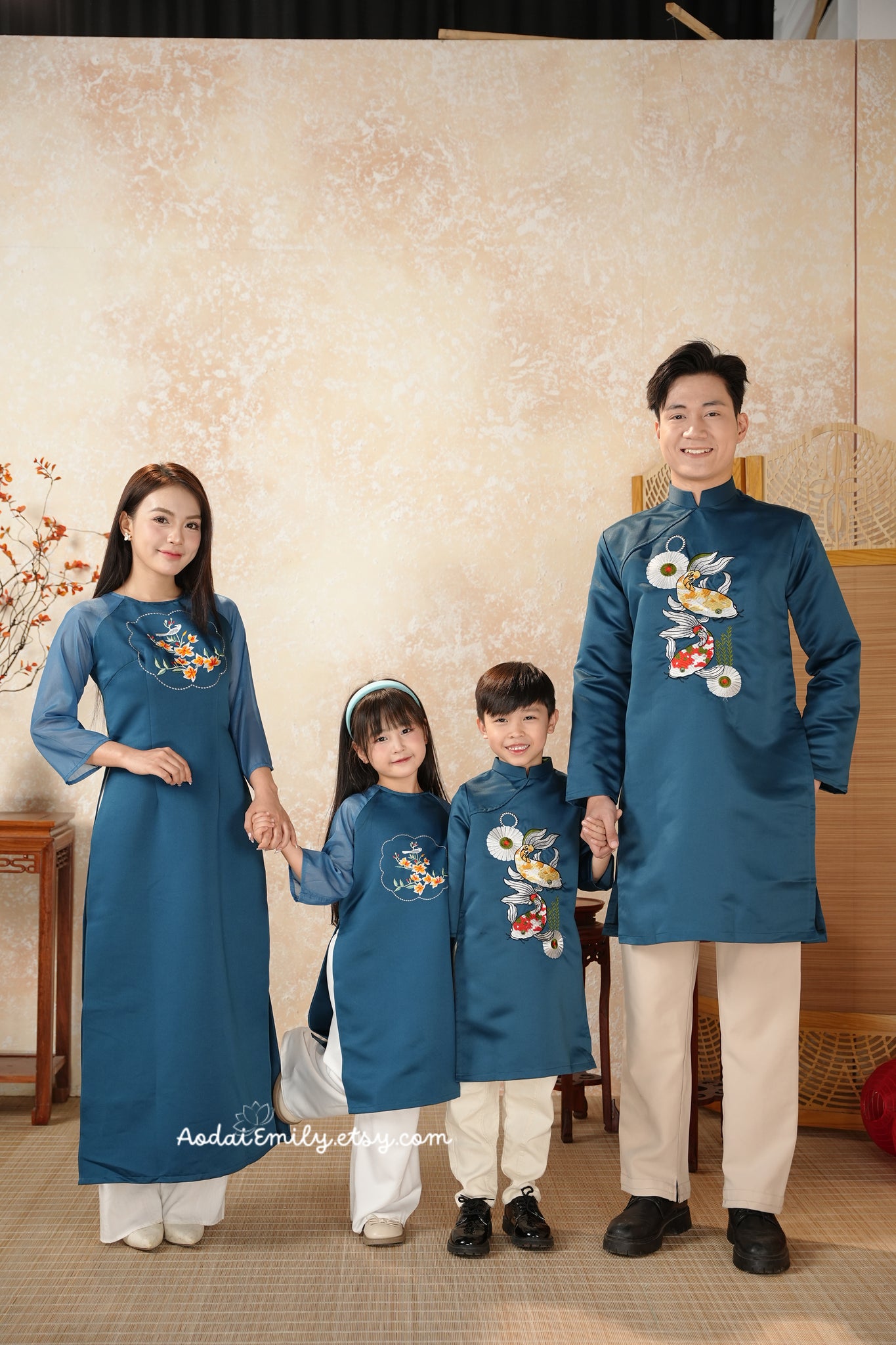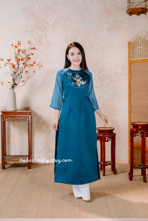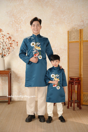 LARA Matching Family Spring Ao Dai Set| Pre-made Ao Dai for Lunar New Year | Ao Dai Gia Dinh Tet| Dark Blue embroidery Ao dai