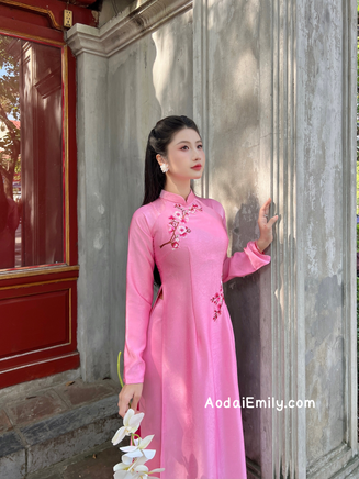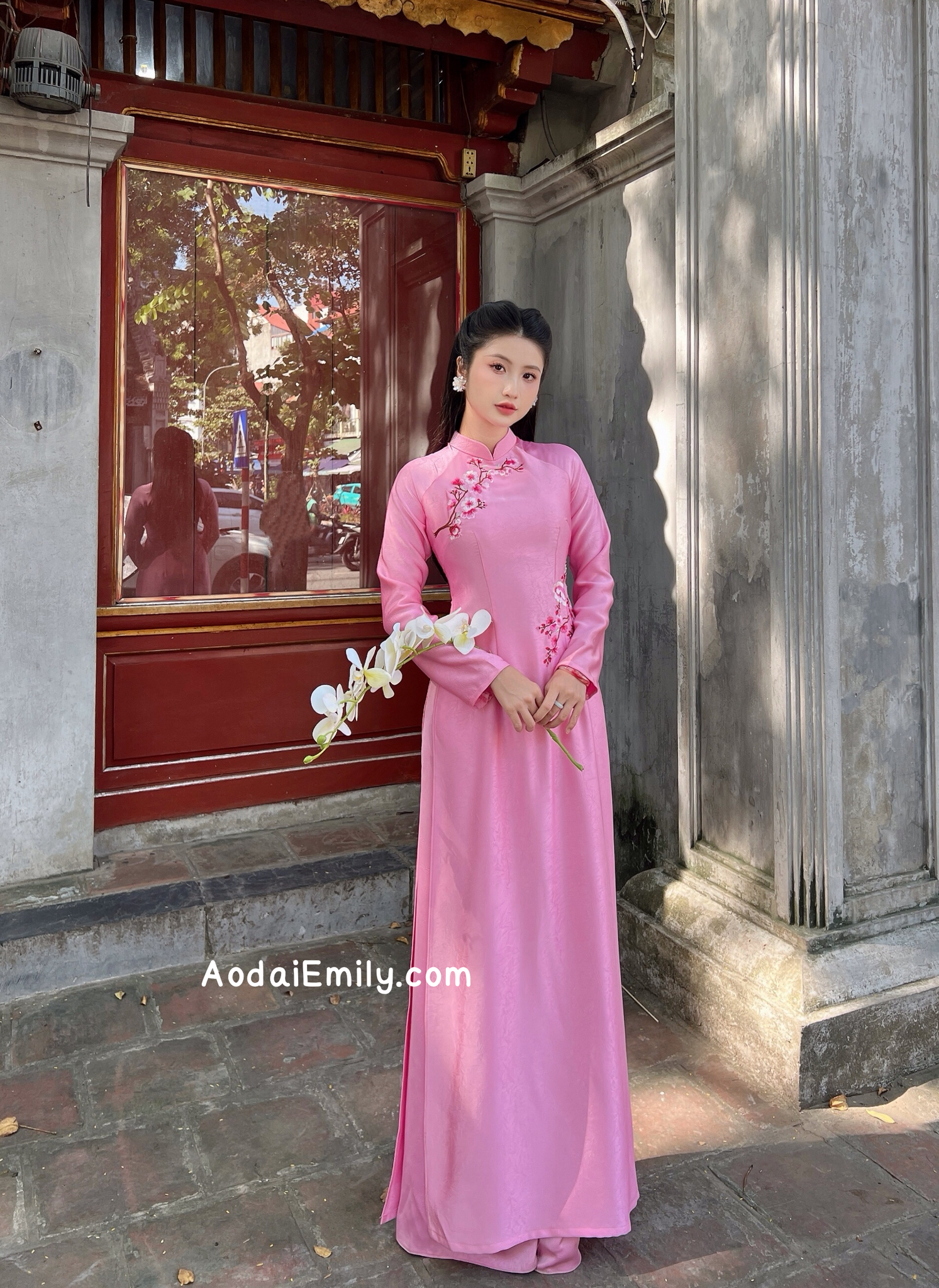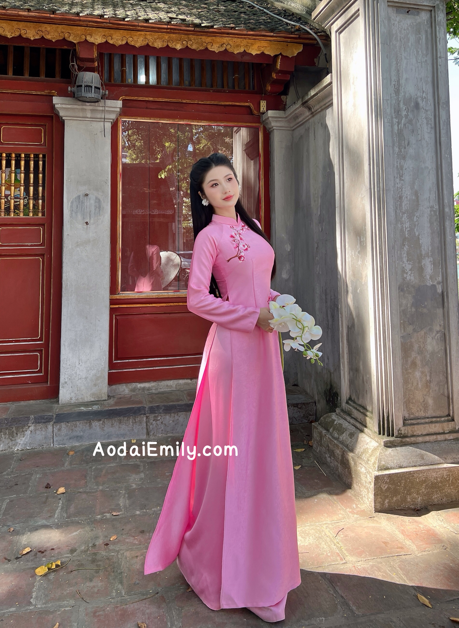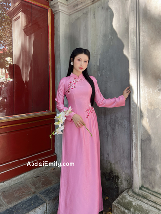 LENNOX Pink Sakura embroidery flowers Pre made ao dai| Traditional Vietnam ao dai| Same color pants included| S-6XL