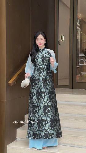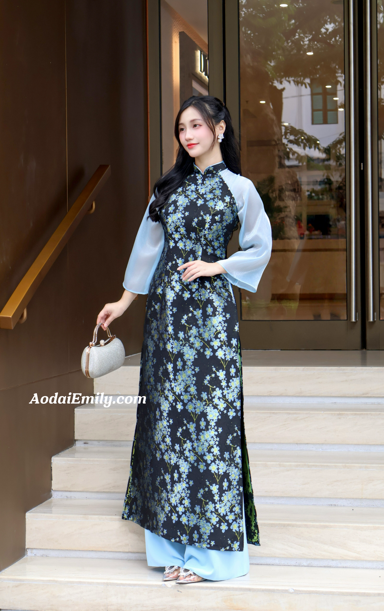 MACY Blue/Black Taffeta Sakura flowers Pre made Ao Dai | Modern Ao Dai for women| with Blue Pants| Trending ao dai| S-4XL