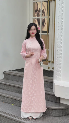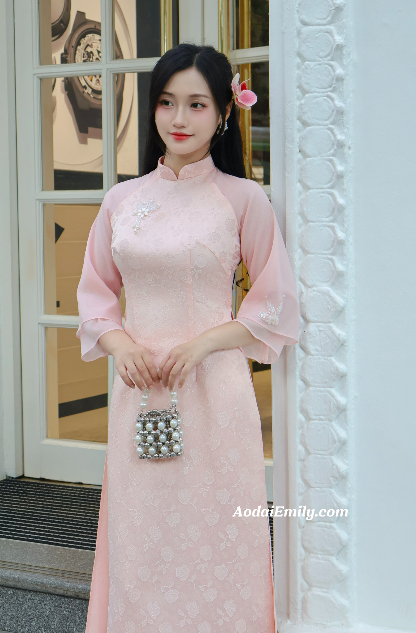 MIRA Pink modern ao dai with hand beading 3D crystals flowers| áo dài cách tân| No pants| Ao dai women| S-6XL